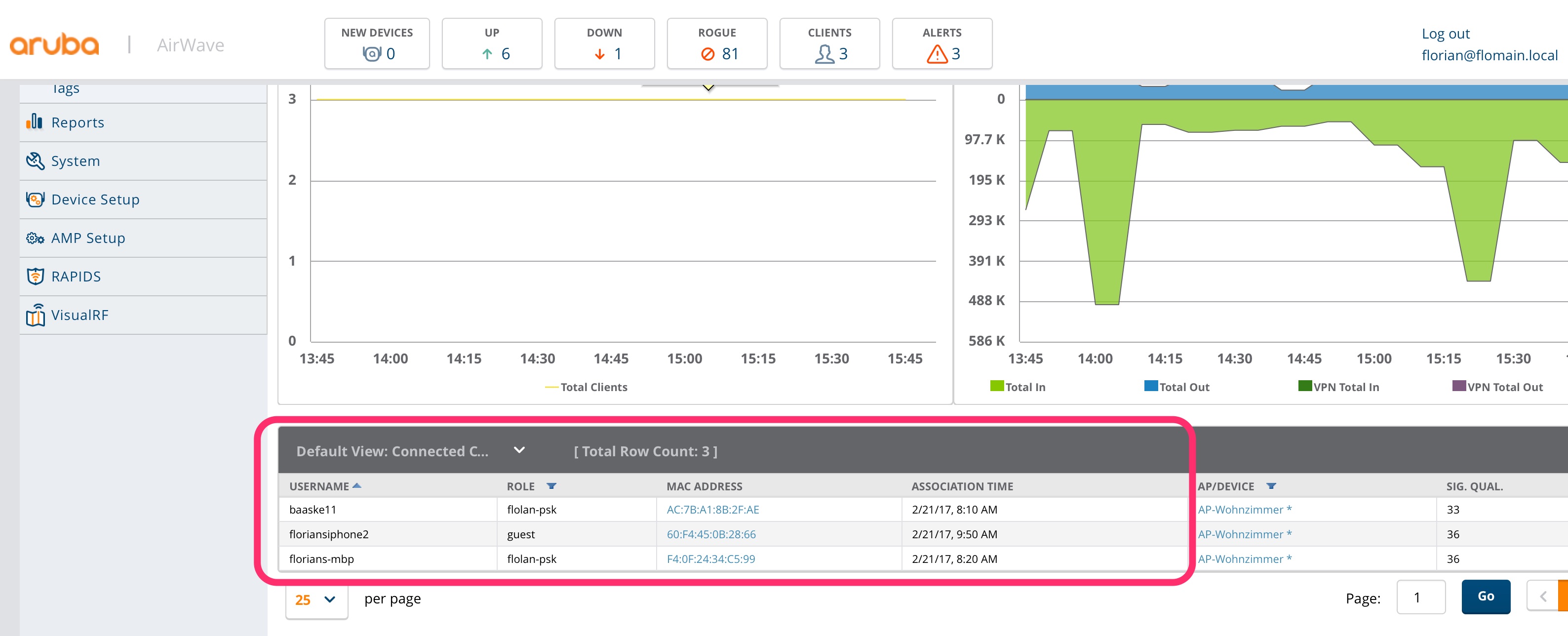 This is an “Aruba Radius Enforcement Profile”. The profile returns the “Device Name” from the guest device database as the radius username. To get this information use the “GuestUser:Visitor Name” variable. And this is the trick to get visibility within MAC authentication.